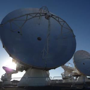 A view from the center of the ALMA array at an elevation of 5,000 meters on the Chajnantor Plain in northern Chile. Each of these radio telescopes has a dish spanning nearly 40 feet across.