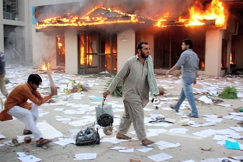 Angry Pakistani protesters seen after setting Pakistan's electrical company office on fire in Gujranwala, near Lahore, Oct 3, 2011.