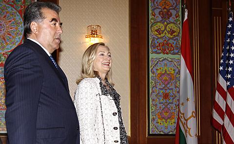 U.S. Secretary of State Hillary Clinton, right, walks alongside Tajikistan's President Emomali Rakhmon at the Palace of the Nation in Dushanbe, Tajikistan, Oct. 22, 2011.